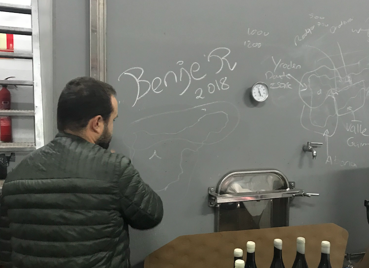 Tal fué mi atracción por los Envinate que cuando volvió a surgir la oportunidad llamé a Roberto Santana para verlo en Tenerife. Me vino a buscar al aeropuerto, nos comimos un bocadillo de pata y queso con un poco de tabasco y un botellin de cerveza. Una conversación chula desde el principio explicandome el clima de la isla, la forma de la misma y los principales accidentes topográficos del lugar. Una vez en bodega Roberto continuó con sus explicaciones usando como pizarra, un depósito de cemento. Desde luego dibujando no se haría millonario, pero quien quiere ser millonario 🙂